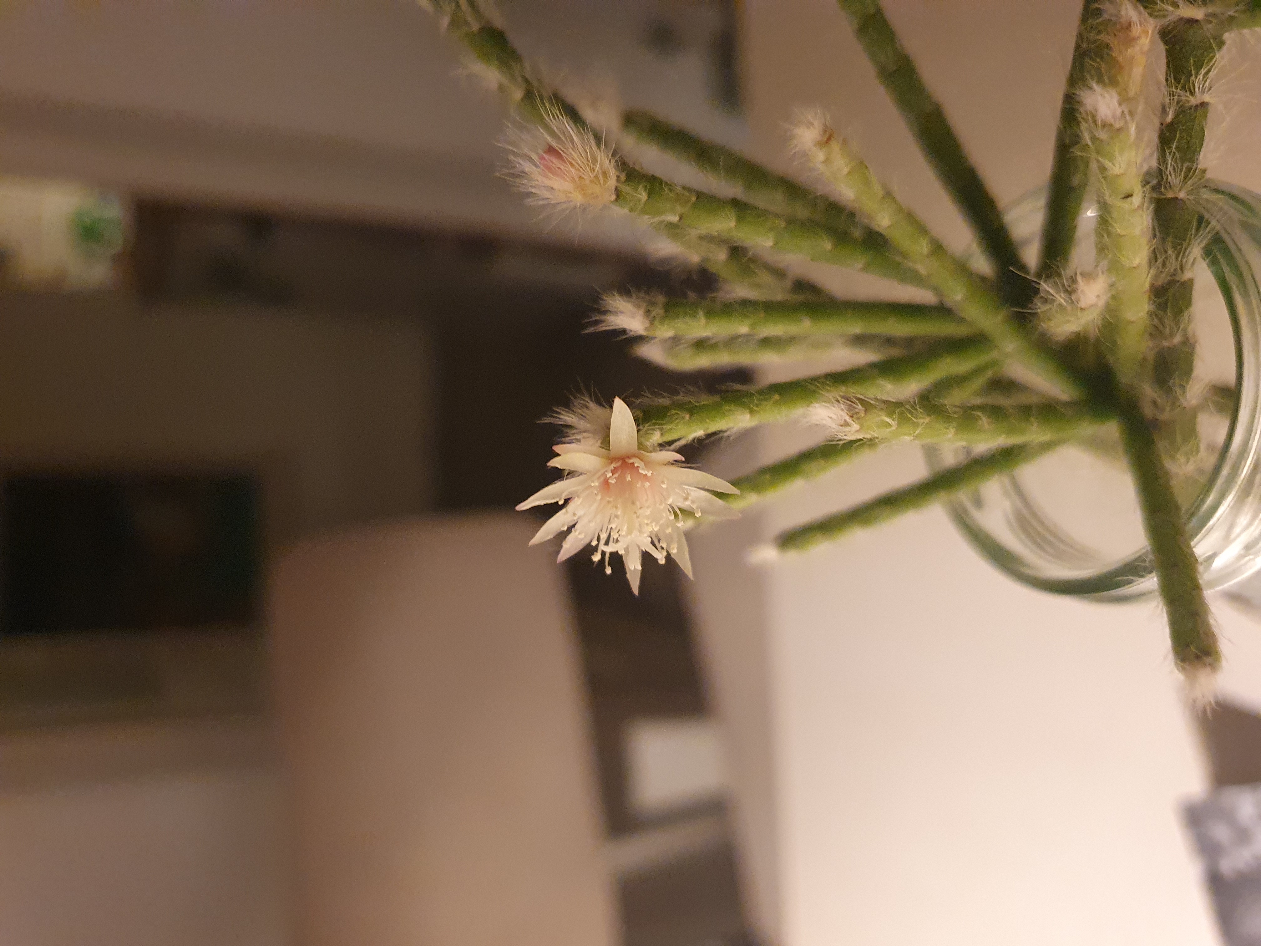 Die unten ist ne Schlumbergera, auch Weihnachtskaktus genannt. Wusst ich bis eben auch nicht, mal im Treppenhaus gefunden. Oben sind die abgeschnittenen Ruten vom Rutenkaktus azs dem letzten Sommer, due treiben gut Wurzeln aus ubd blühen jetzt nach und nach