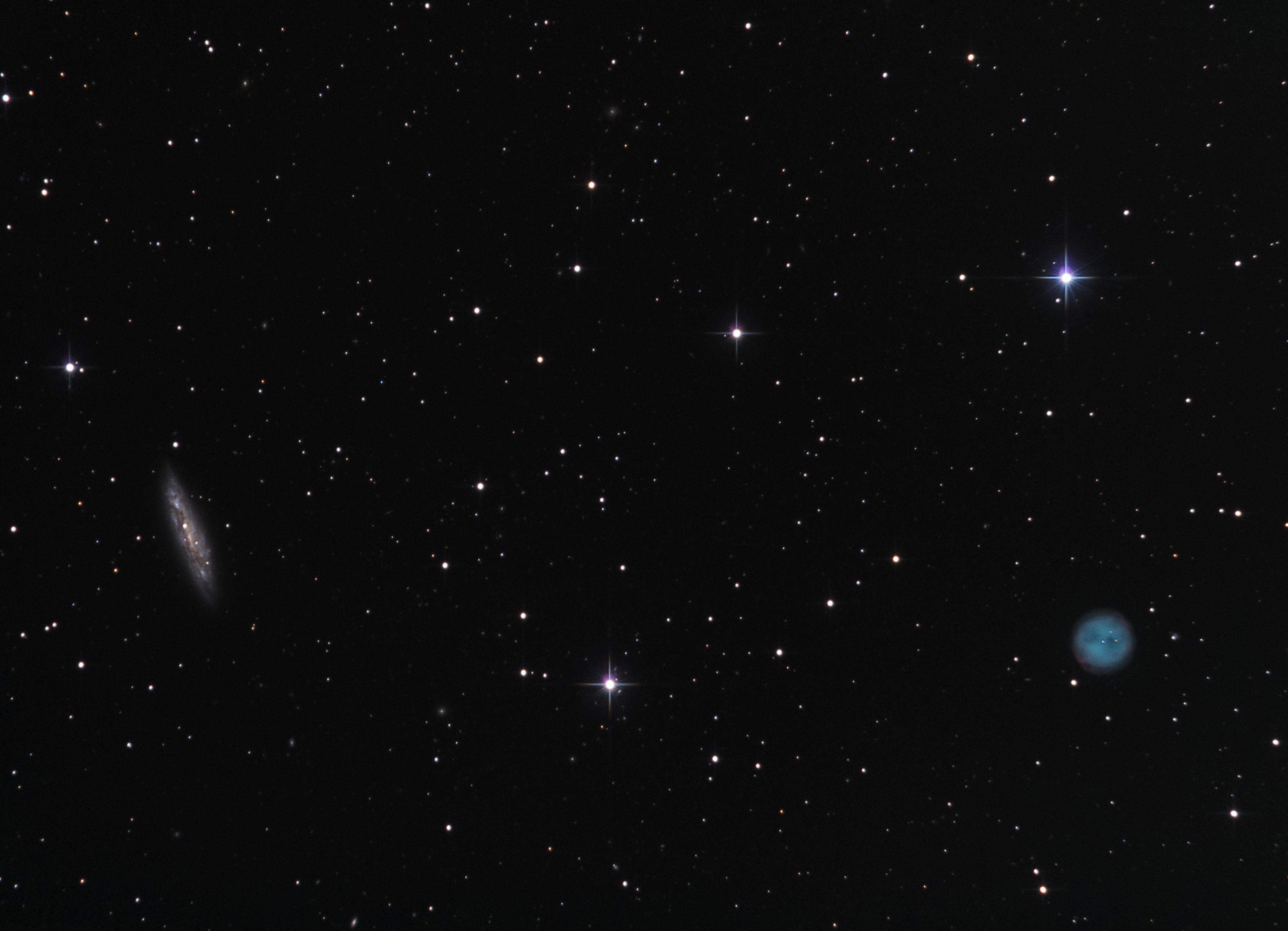 Der Eulen-Nebel, ein explodierter Stern bei uns in der Galaxie (2025,7 Lichtjahre Entfernung),und das Surfboard sehr weit draussen auf intergalaxtischen Gewässern (45,994Mio Lichtjahre weit weg).