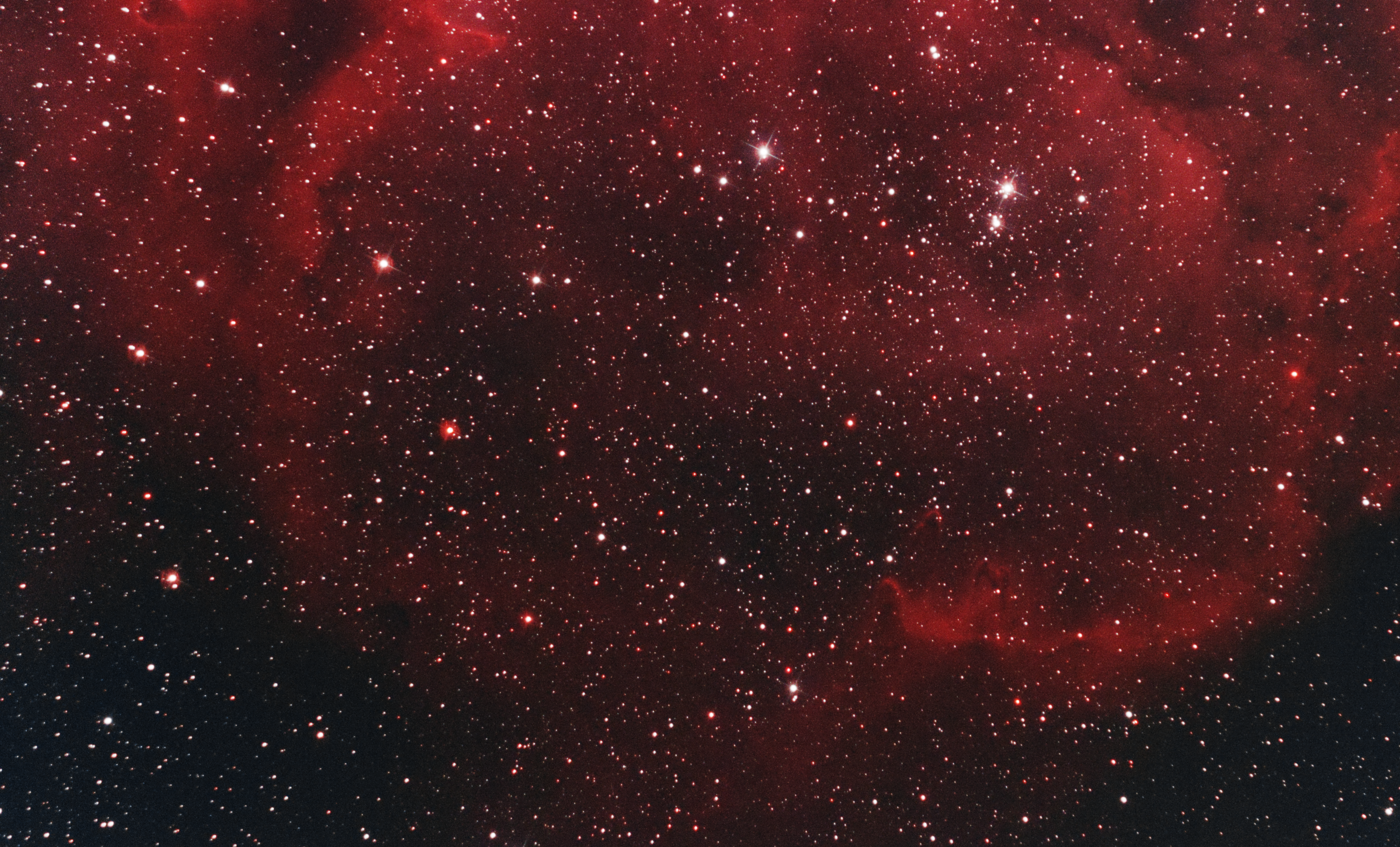 Durch die hintereinandergeschraubten Filter (IR/UV-cut und HA/OII Schmallband) sind leider Höfe um helle Sterne entstanden.